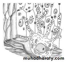 (5)The basolateral surfaces of the cells contact expanded terminal discs of unmyelinated sensory fibers that penetrate the basal lamina.
