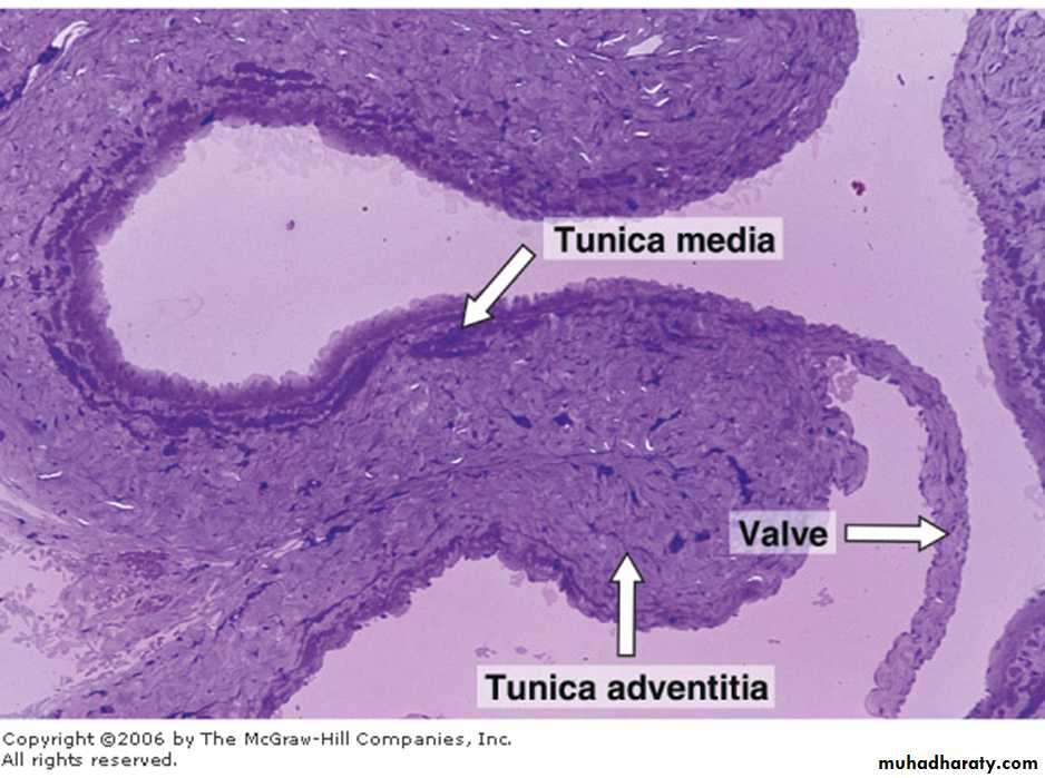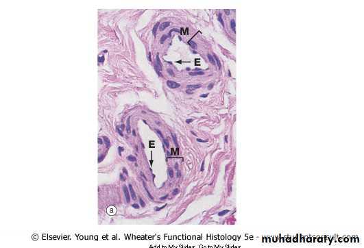 3. thin media consisting of a few smooth muscle fibers (collecting venules). As venule size increases, the amount of muscle increases (muscular venules).4. well developed adventitia rich in collagen fibers.