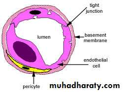 In transverse (cross-) sections we find that the circumferential wall of a capillary is generally formed by 2-3 squamous cells held together by occluding or gap junctions. Nuclei of the cells buldge into the capillary lumen.