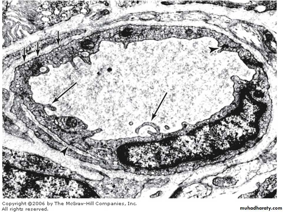 They are flat polygonal cells connected to each other by junctional complexes.They have numerous pinocytotic vesicles V and specialised membrane-bound organelles called Weibel-Palade bodies WP which store Von Willebrand factor.
