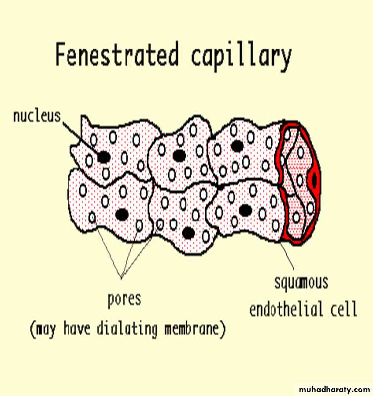 These are found in some tissues where there is extensive molecular exchange with the blood such as the small intestine, endocrine glands and the kidney. The 'fenestrations' are pores that will allow larger molecules though.These capillaries are more permeable than continuous capillaries.