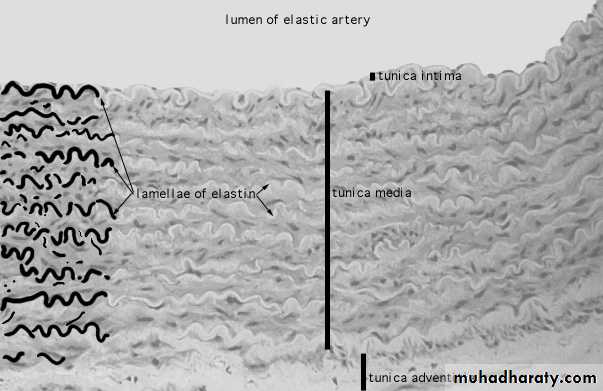 They have a yellowish color from the accumulation of elastin in the media.The intima is thicker than the corresponding tunic of a muscular artery. An internal elastic lamina, although present, may not be easily discerned, since it is similar to the elastic laminae of the next layer.