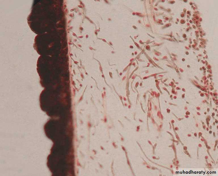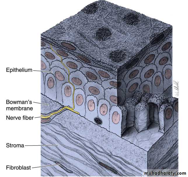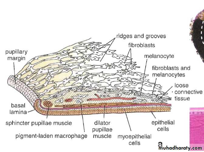 The anterior surface consists of irregular layer of fibroblasts and melanocytes