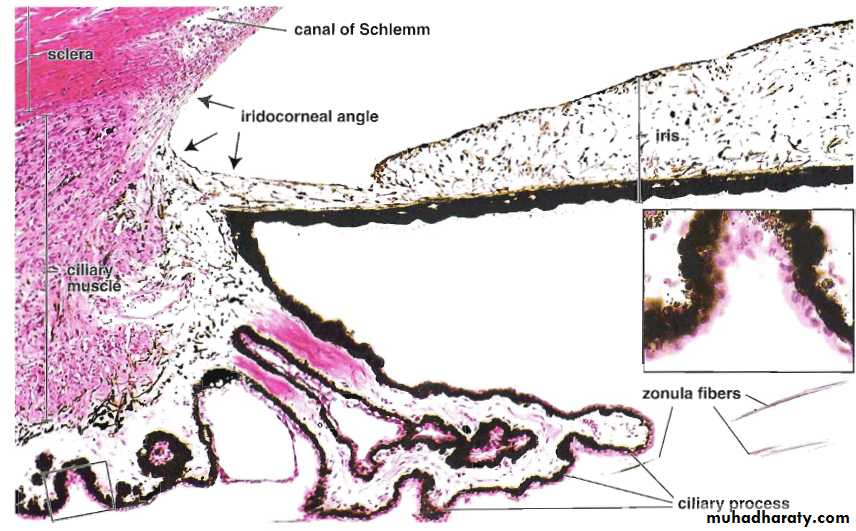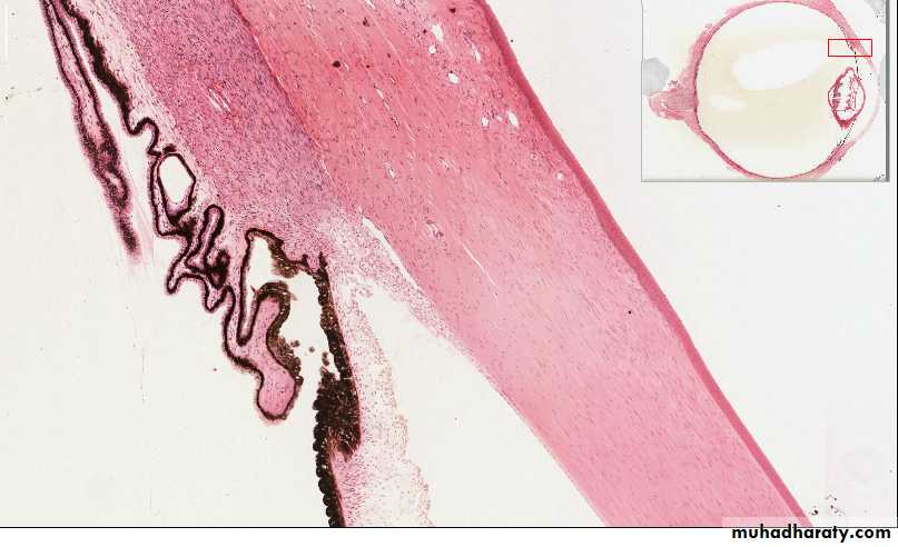 • In the corneoscleral junction the corneal cellular lamellae merge with the collagen fibers of the sclera• Endothelial lined channels unite to form the canal of Schlemm draining the aqueous humour to the venous blood