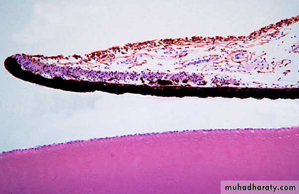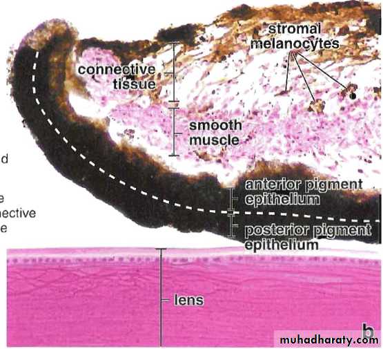 The posterior surface is smooth with two layers of epithelium contain melanin granules
