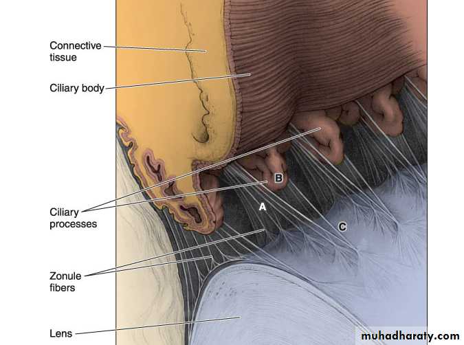 The ciliary zonule lie between the lens and the ciliary body, holds the lens in position and important for the accommodation