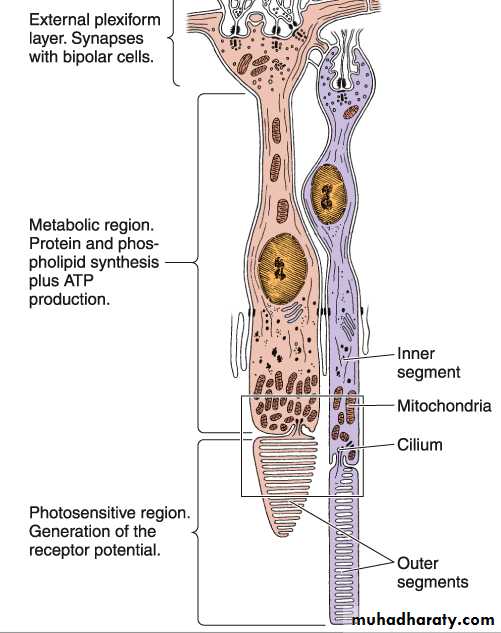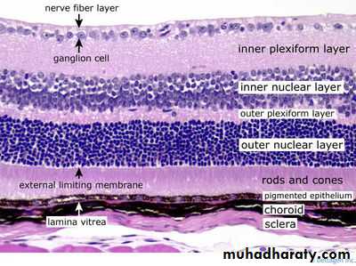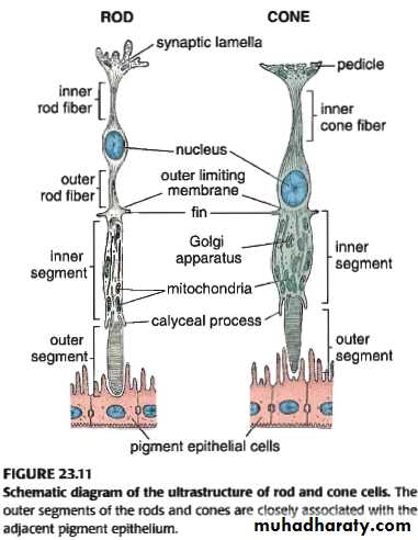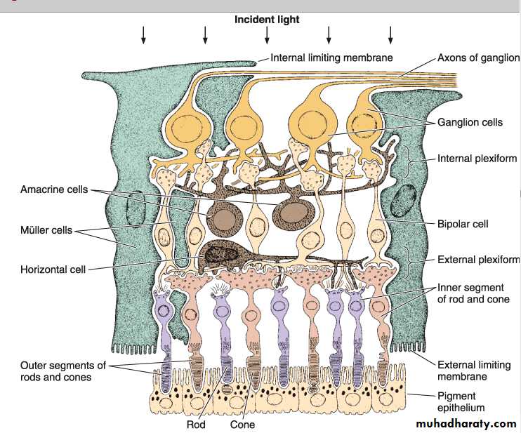 Is composed of three layers of neurons and two layers of fibers and two layers of fibers and synapsesRods and Cones