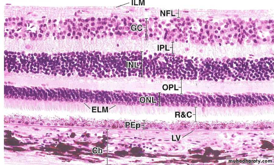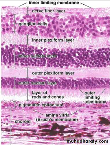 The layers of the retina, Bruch’s membrane separates the choroid from the pigment epithelium of the retina