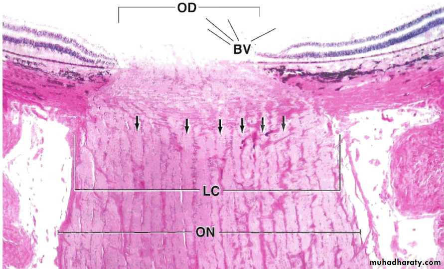 Human eye showing: OD optic disc,ON optic nerve, LC lamina cribrosa or cribriform plate, Arrows() are openings in the sclera for the ganglion cells to form the optic nerve, BV blood vessels .