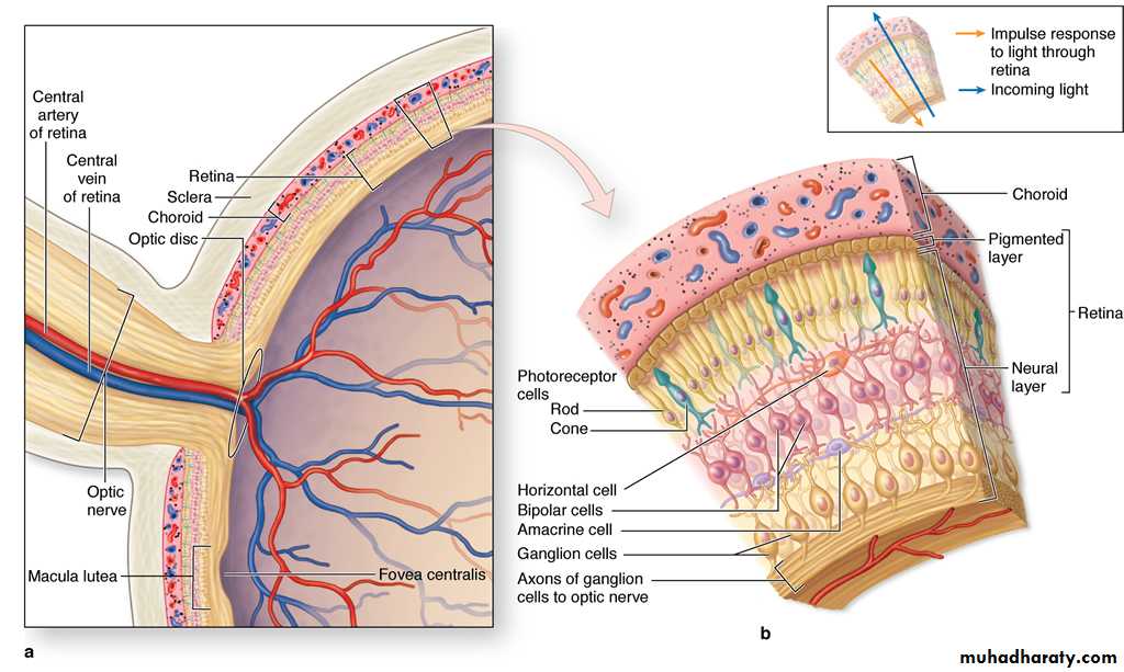 In the previous slide, the normal retina is examined with an ophthalmoscope. The dark area near the center is the fovea . This area is actually a depression in the retina. Although this photo does not show it, the foveal area has a yellow pigmentation called the macula lutea. When we fixate (look directly at) objects, images of these objects are projected on to the fovea. It is the retinal location of our best visual acuity and color vision.The optic disc is the place where all the blood vessels and optic nerves converge and go out of the retina to the brain. The optic disc, also called the blind spot, is where the axons of the ganglion cells leave the retina to form the optic nerve.