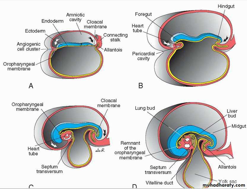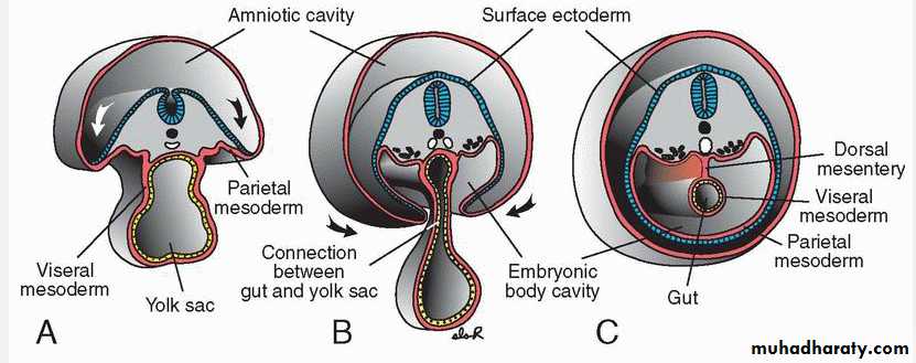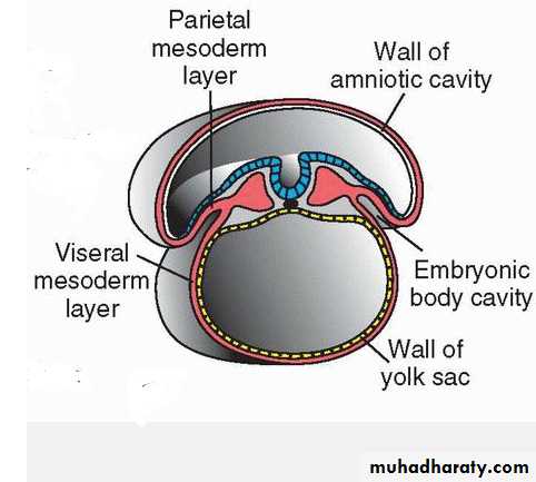 At the end of the third week, intraembryonic mesoderm differentiates into paraxial mesoderm, that forms somitomeres and somites; intermediate mesoderm, that contributes to the urogenital system; and lateral plate mesoderm that is involved in forming the body cavity .Soon after it forms as a solid mesodermal layer, clefts appear in the lateral plate mesoderm that coalesce to split the solid layer into two: (a) parietal (somatic) layer adjacent to the surface ectoderm and continuous with the extraembryonic parietal mesoderm layer over the amnion and (b) the visceral (splanchnic) layer adjacent to endoderm forming the gut tube and continuous with the visceral layer of extraembryonic mesoderm covering the yolk sac