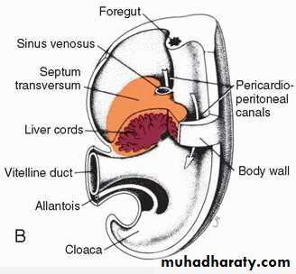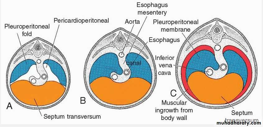 The septum transversum is a thick plate of mesodermal tissue occupying the space between the thoracic cavity and the stalk of the yolk sac. This septum does not separate the thoracic and abdominal cavities completely but leaves large openings, the pericardioperitoneal canals, on each side of the foregutAs a result of the rapid growth of the lungs, the pericardioperitoneal canals become too small, and the lungs begin to expand into the mesenchyme of the body wall dorsally, laterally, and ventrally.