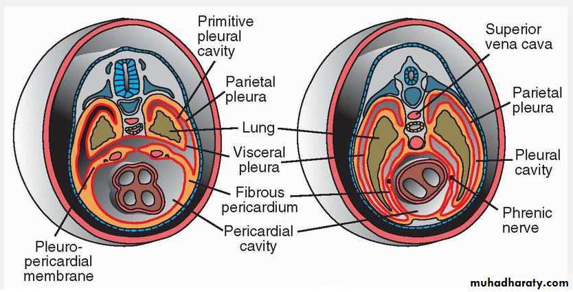 With expansion of the lungs, mesoderm of the body wall splits into two components: (a) the definitive wall of the thorax and (b) the pleuropericardial membranes, which are extensions of the pleuropericardial folds that contain the common cardinal veins and phrenic nerves