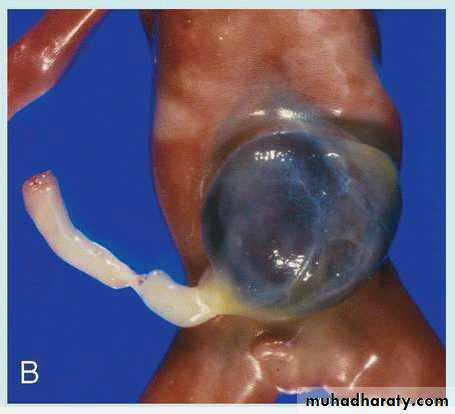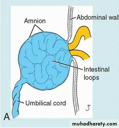 Ventral body wall defects occur in the thorax, abdomen, and pelvis and involve the heart (ectopia cordis), abdominal viscera (gastroschisis), and/or urogenital organs (bladder or cloacal exstrophy)Omphalocele represents another ventral body wall defect but it does not arise from a failure in body wall closure. Instead, it originates when portions of the gut tube (the midgut), that normally herniates into the umbilical cord during the 6th to 10th weeks fails to return to the abdominal cavity.