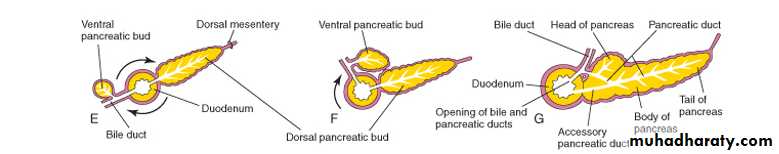 When the duodenum rotates to the right and becomes C-shaped, the ventral pancreatic bud moves dorsally in a manner similar to the shifting of the entrance of the bile duct.