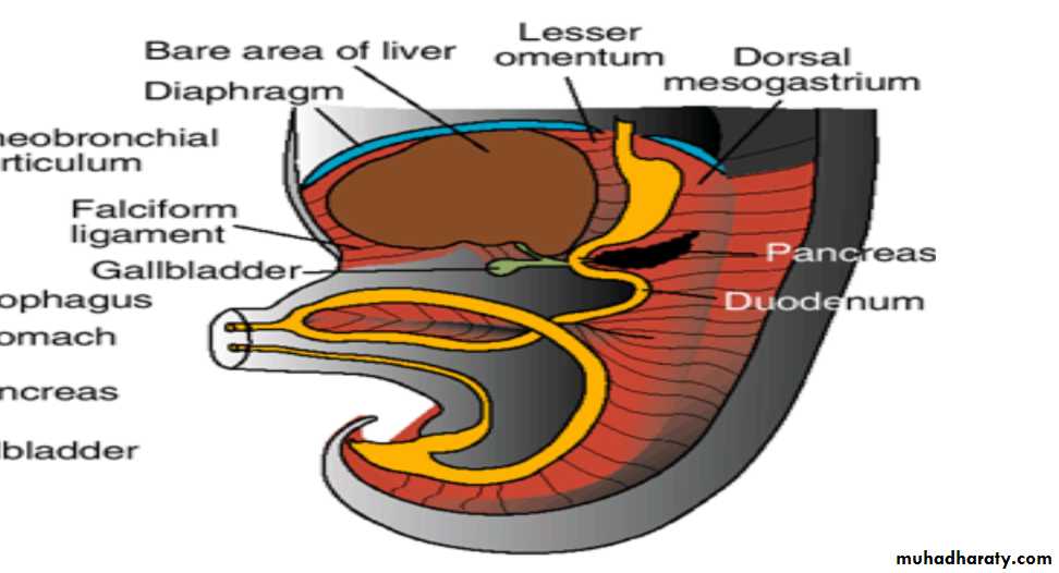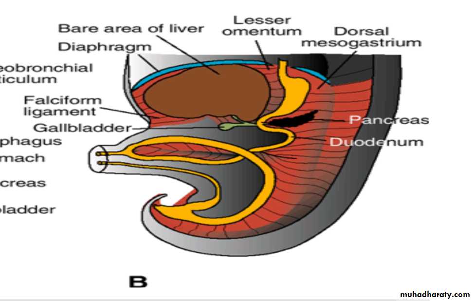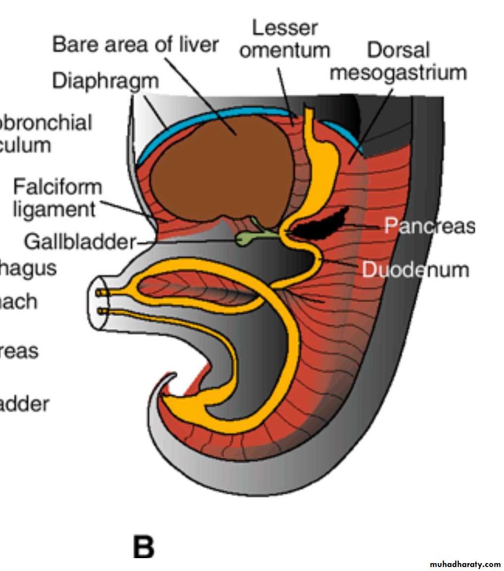 The surface of the liver that is in contact with the future diaphragm is never covered by peritoneum; it is the bare area of the liver