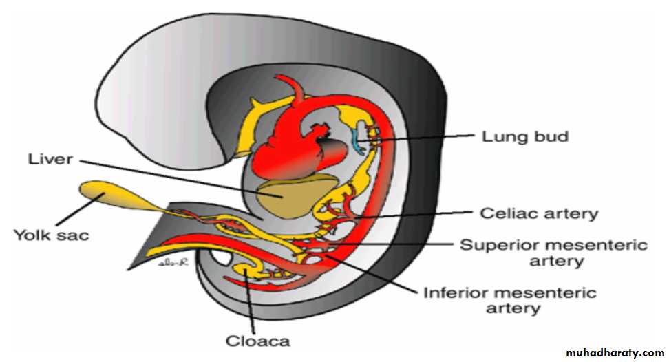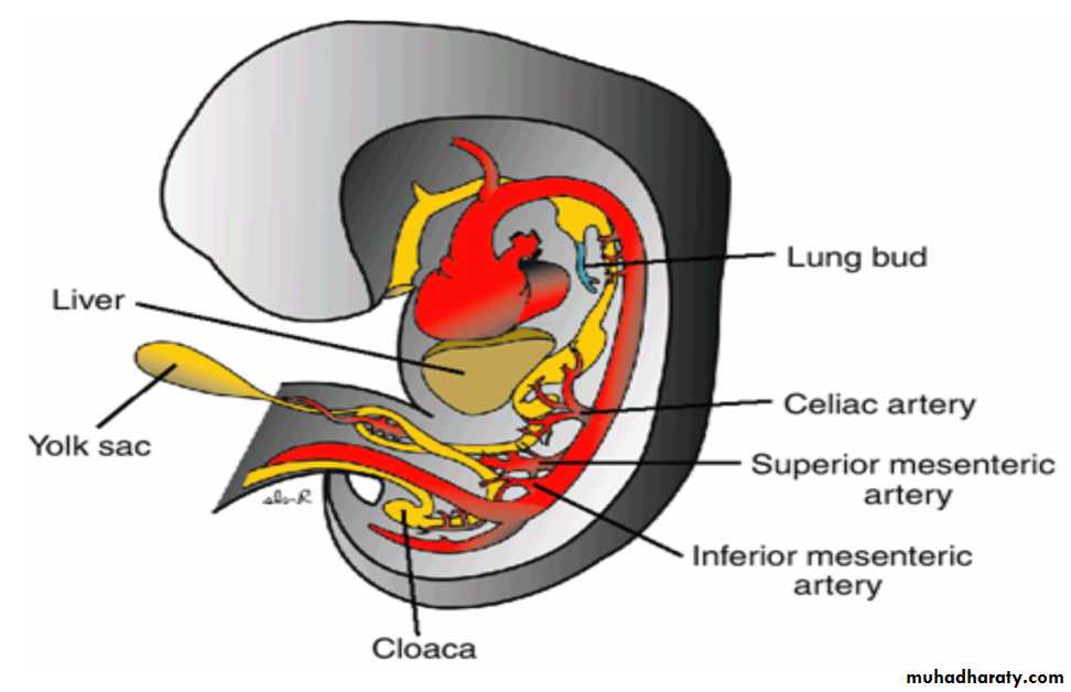 Coincident with growth in length, the primary intestinal loop rotates around an axis formed by the superior mesenteric artery