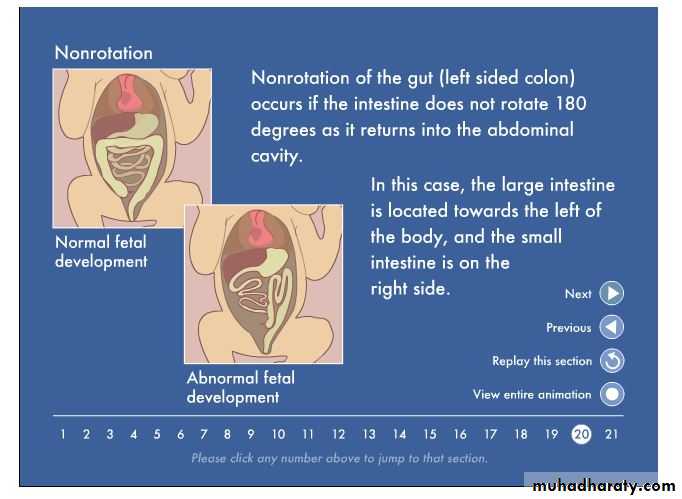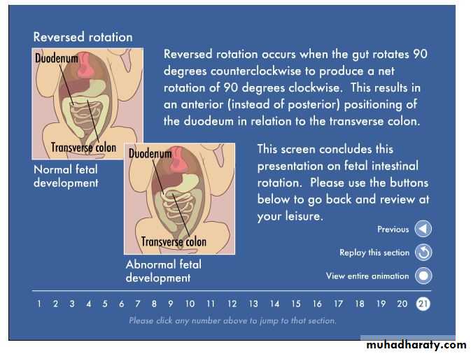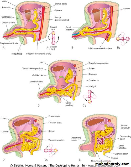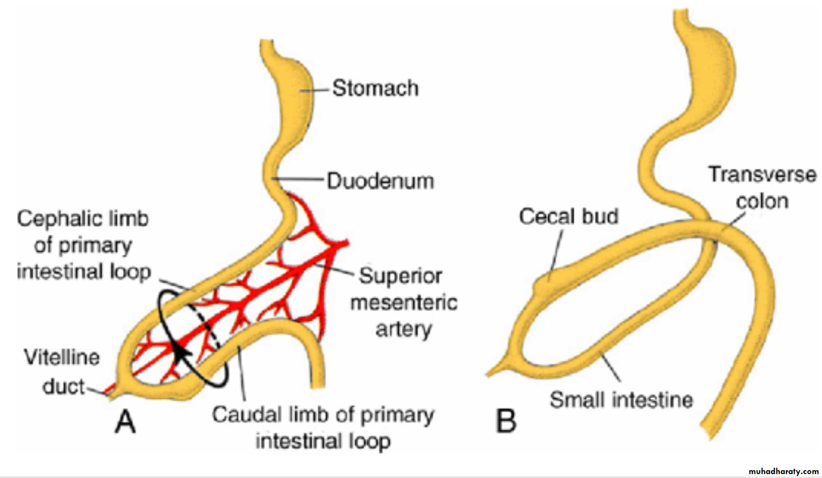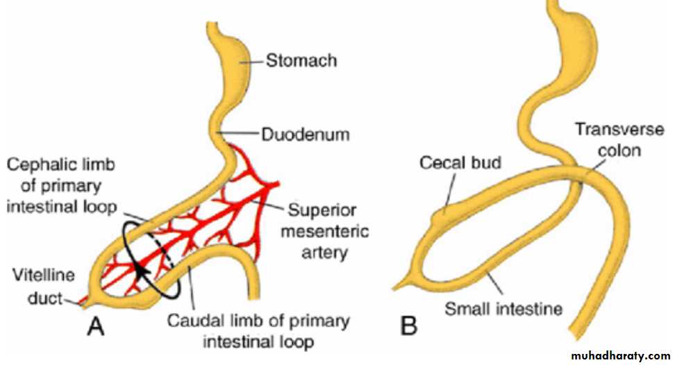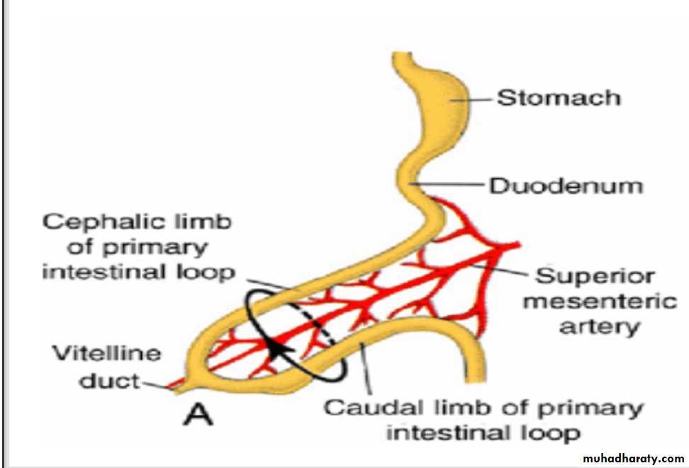 Rotation occurs during herniation (about 90°), as well as during return of the intestinal loops into the abdominal cavity (remaining 180°)