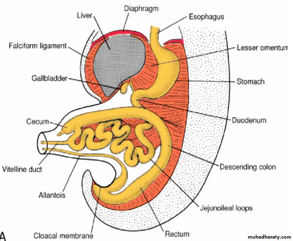 The cecal bud, which appears at about the sixth week as a small conical dilation of the caudal limb of the primary intestinal loop, is the last part of the gut to reenter the abdominal cavity.
