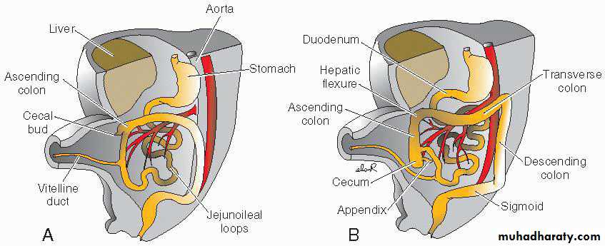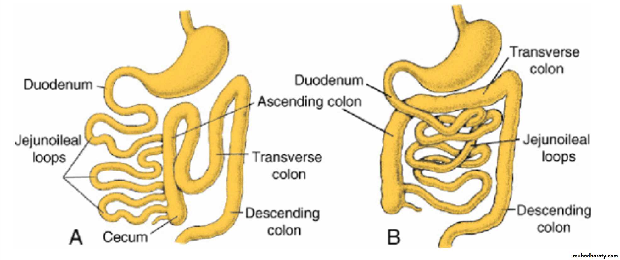(A) The colon is on the left side of the abdomen, and the small intestinal loops are on the right. The ileum enters the cecum from the right.(B) The primary intestinal loop is rotated 90° clockwise (reversed rotation). The transverse colon passes behind the duodenum.