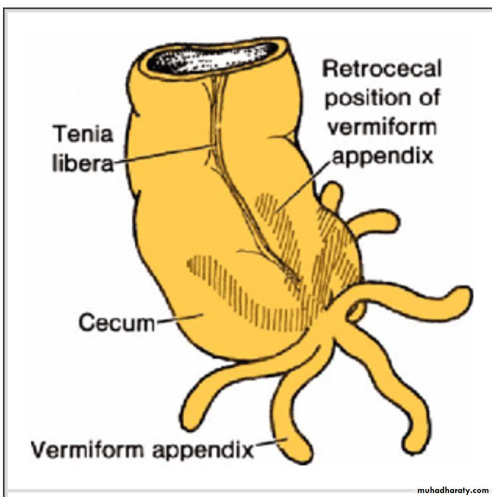 Since the appendix develops during descent of the colon, its final position frequently is posterior to the cecum or colon )retrocecal or retrocolic, respectively)