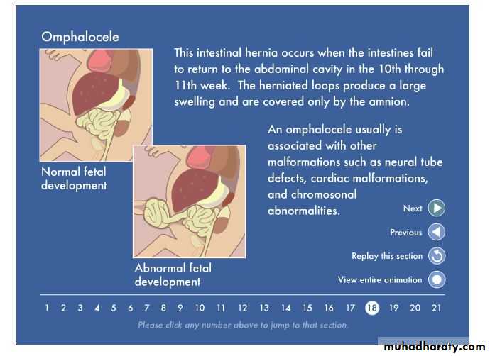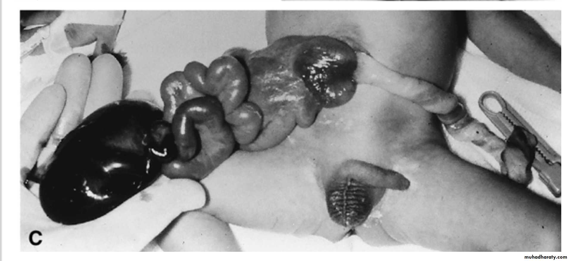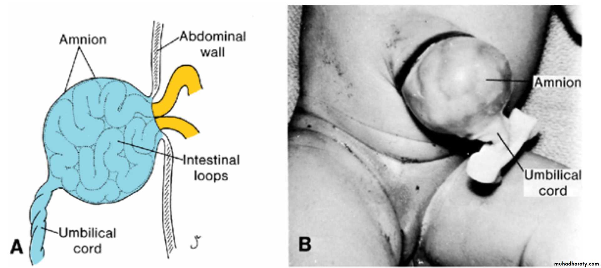Loops of bowel return to the body cavity but herniate again through the body wall, usually to the right of the umbilicus in the region of the regressing right umbilical vein. Unlike omphalocele, the defect is not covered by amnion.