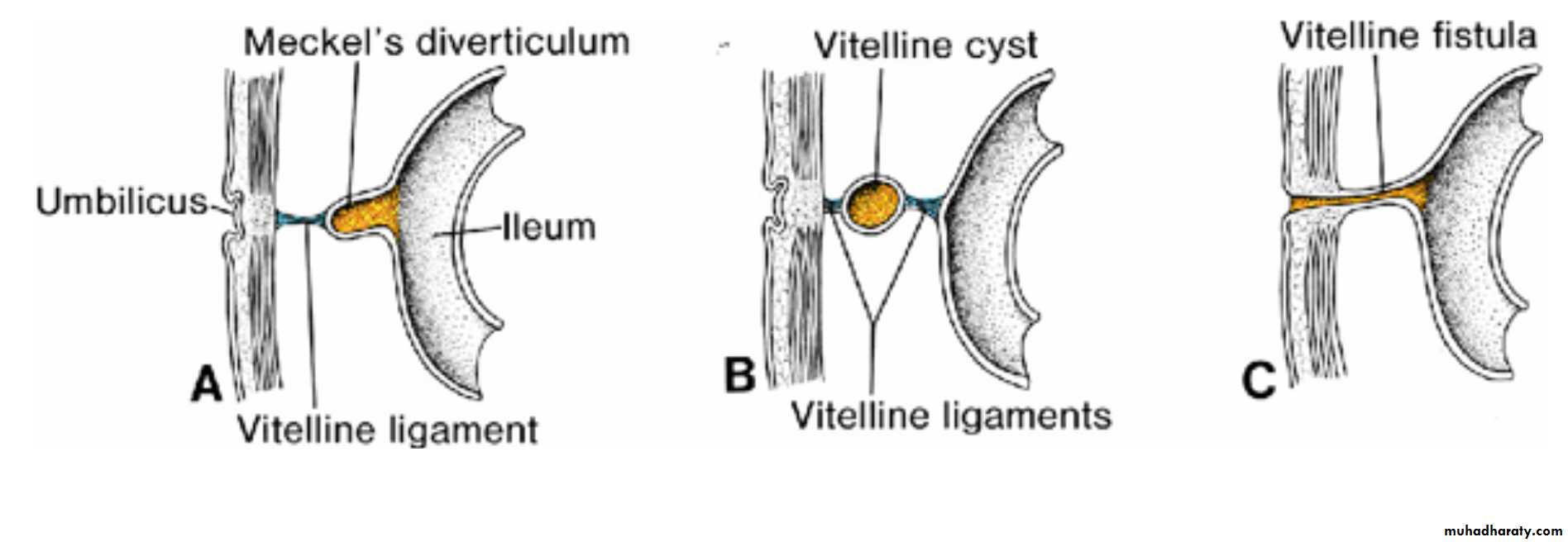 B. Vitelline cyst attached to the umbilicus and wall of the ileum by vitelline ligaments.