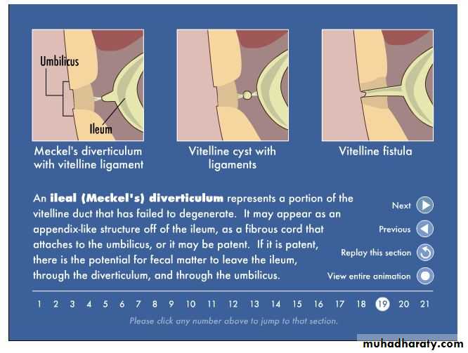 In about 50% of cases, the appendix is retrocecal or retrocolicOmphalocele