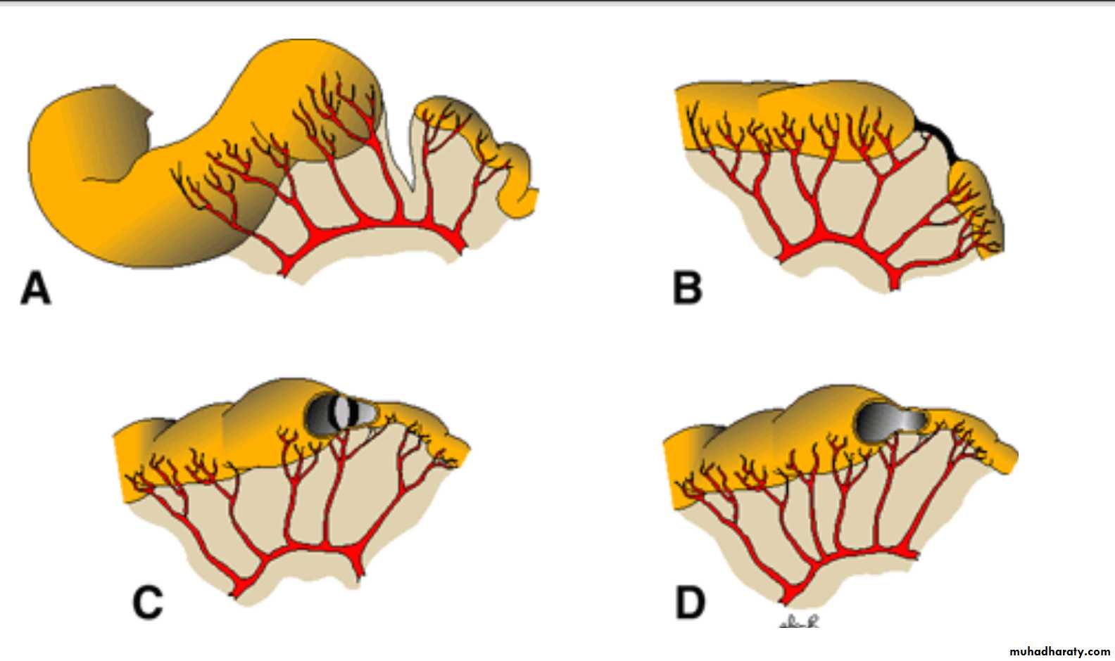 In 50% of cases a region of the bowel is lost(A), and in 20% a fibrous cord remains (B).In another 20%, there is narrowing, with a thin diaphragm separating the larger and smaller pieces of bowel