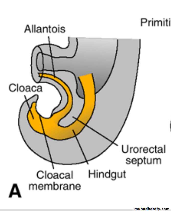 A layer of mesoderm, the Urorectal septum, separates the region between the allantois and hindgut. This septum is derived from the merging of mesoderm covering the yolk sac and surrounding the allantois .As the embryo grows and caudal folding continues, the tip of the urorectal septum comes to lie close to the cloacal membrane, although the two structures never make contact .