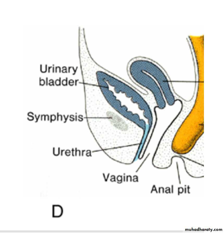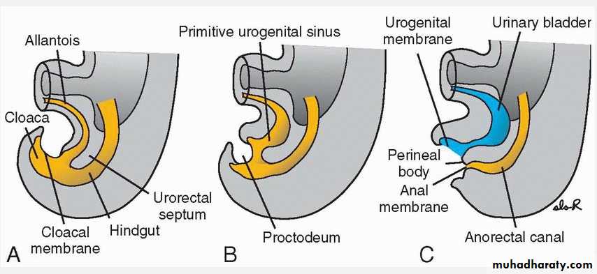 At the end of the seventh week, the cloacal membrane ruptures, creating the anal opening for the hindgut and a ventral opening for the urogenital sinus.Between the two, the tip of the urorectal septum forms the perineal body