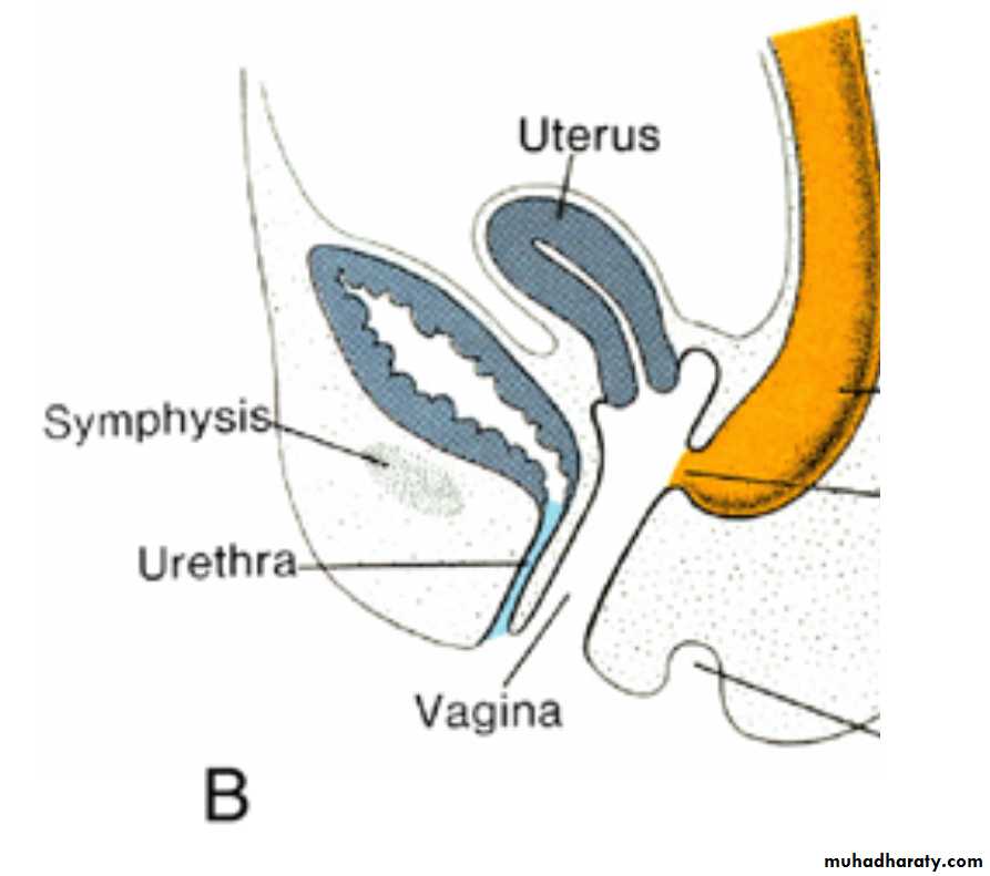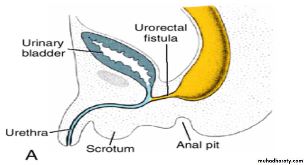 Rectourethral (A) and rectovaginal (B) fistulas that result from incomplete separation of the hindgut from the urogenital sinus by the urorectal septum.These defects may also arise if the cloaca is too small, which causes the opening of the hindgut to shift anteriorly.