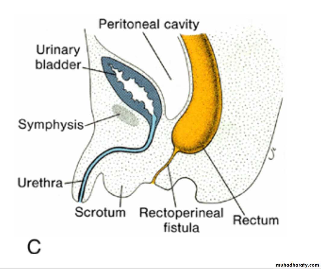 Rectoperineal fistula (rectoanal atresia). These defects probably result from vascular accidents involving the caudal region of the hindgut, resulting in atresias and fistulas.Imperforate anus