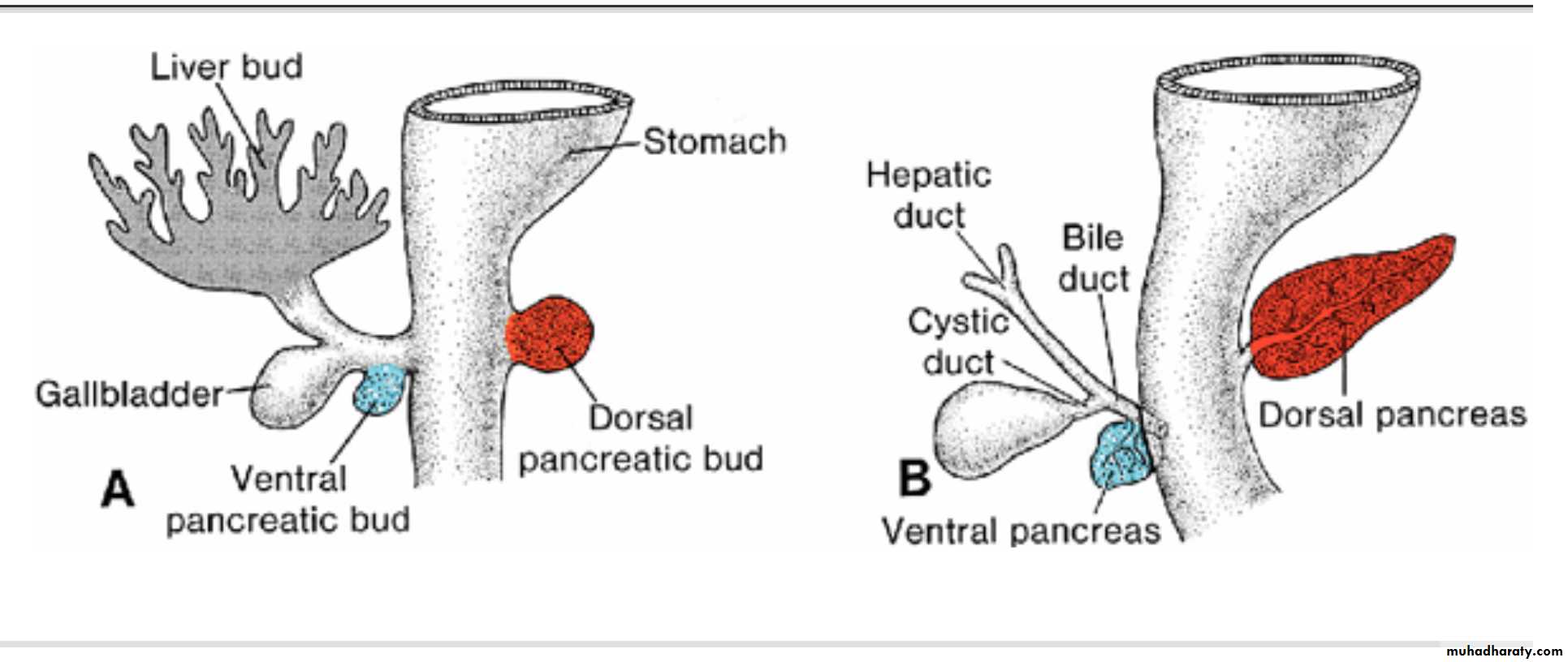 The dorsal pancreatic bud is in the dorsal mesentery, Tthe ventral pancreatic bud is close to the bile duct .