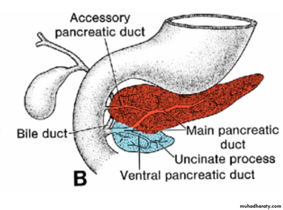 The ventral bud forms the uncinate process and inferior part of the head of the pancreas. The remaining part of the gland is derived from the dorsal bud.