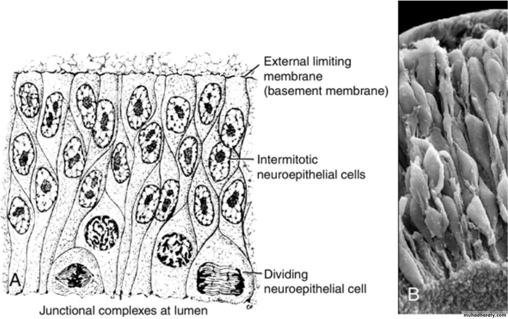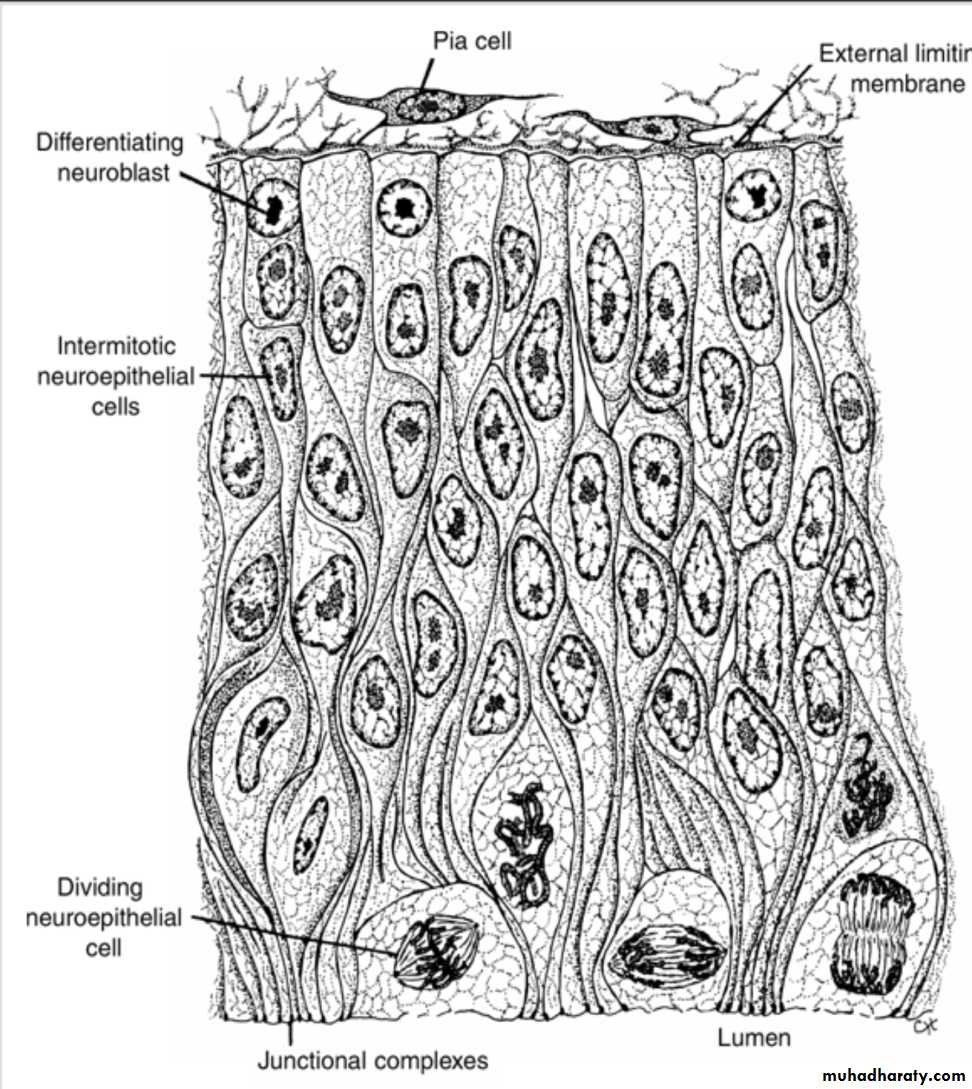 The wall of a recently closed neural tube consists of neuroepithelial cells which extend over the entire thickness of the wall and form a thick pseudostratified epithelium .Junctional complexes at the lumen connect them.