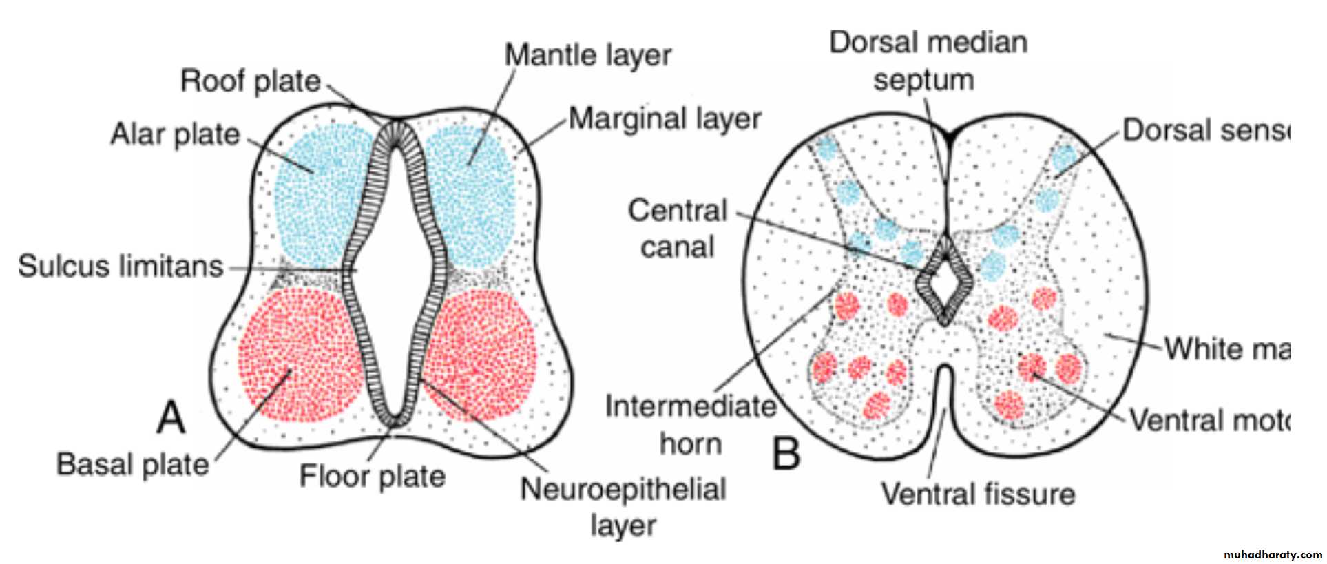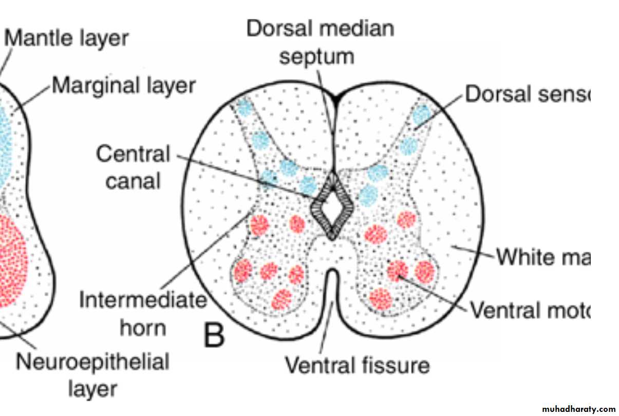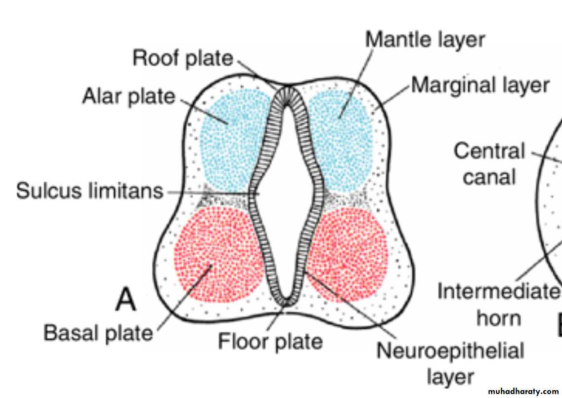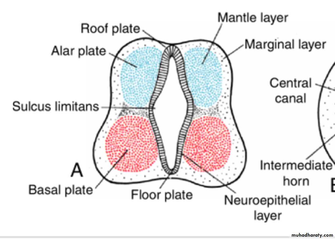As a result of continuous addition of neuroblasts to the mantle layer, each side of the neural tube shows a ventral and a dorsal thickening.The ventral thickenings, the Basal plates, which contain ventral motor horn cells, form the motor areas of the spinal cord;