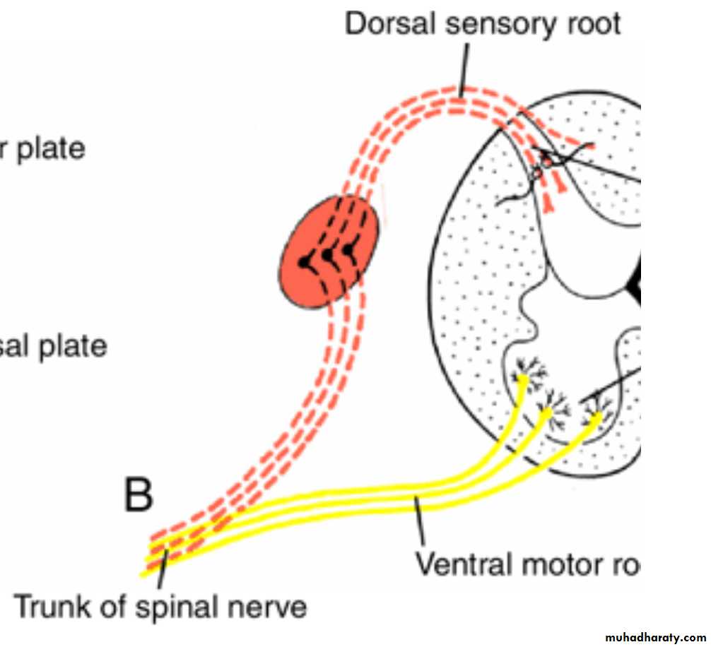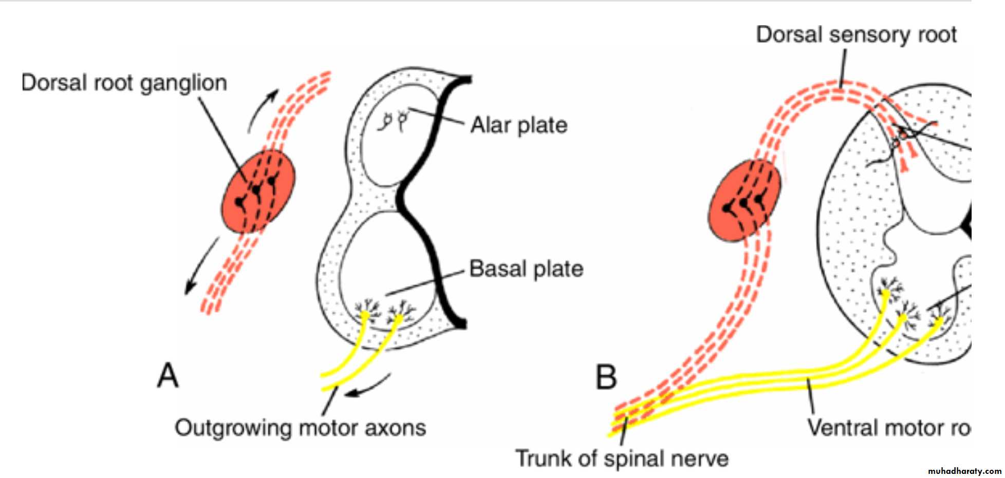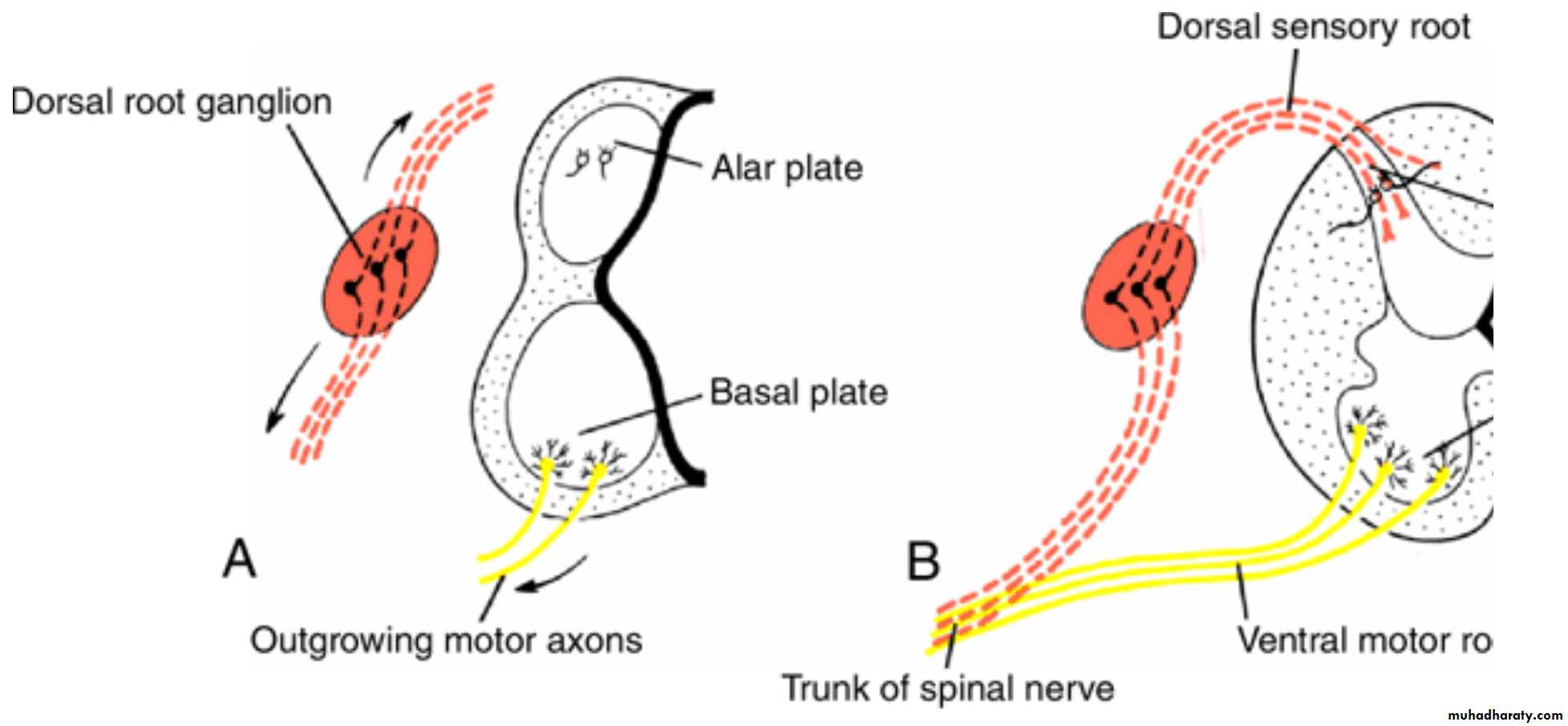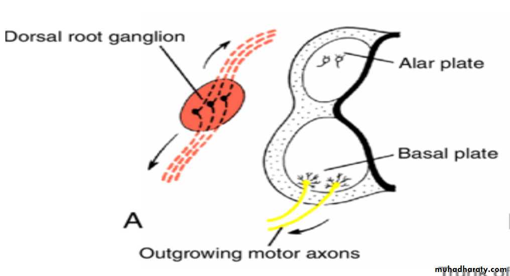 As a result of continuous addition of neuroblasts to the mantle layer, each side of the neural tube shows a ventral and a dorsal thickening.The ventral thickenings, the Basal plates, which contain ventral motor horn cells, form the motor areas of the spinal cord;