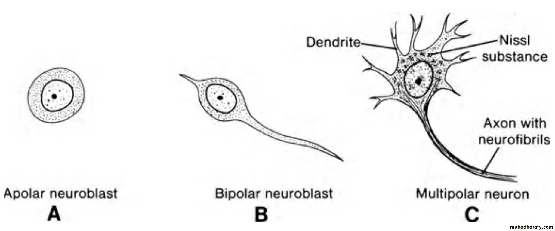 Neuroblasts, or primitive nerve cellsarise exclusively by division of the neuroepithelial cells. Initially they have a central process extending to the lumen (transient dendrite), but when they migrate into the mantle layer, this process disappears, and neuroblasts are temporarily round and apolar (A).