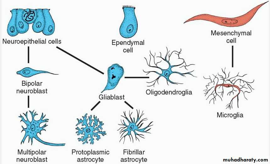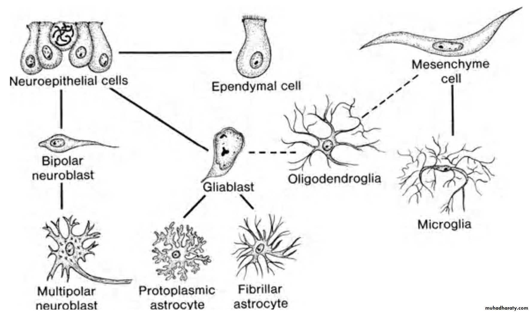 The majority of primitive supporting cells, the gliablasts, are formed by neuroepithelial cells after production of neuroblasts ceases.Gliablasts migrate from the neuroepithelial layer to the mantle and marginal layers.