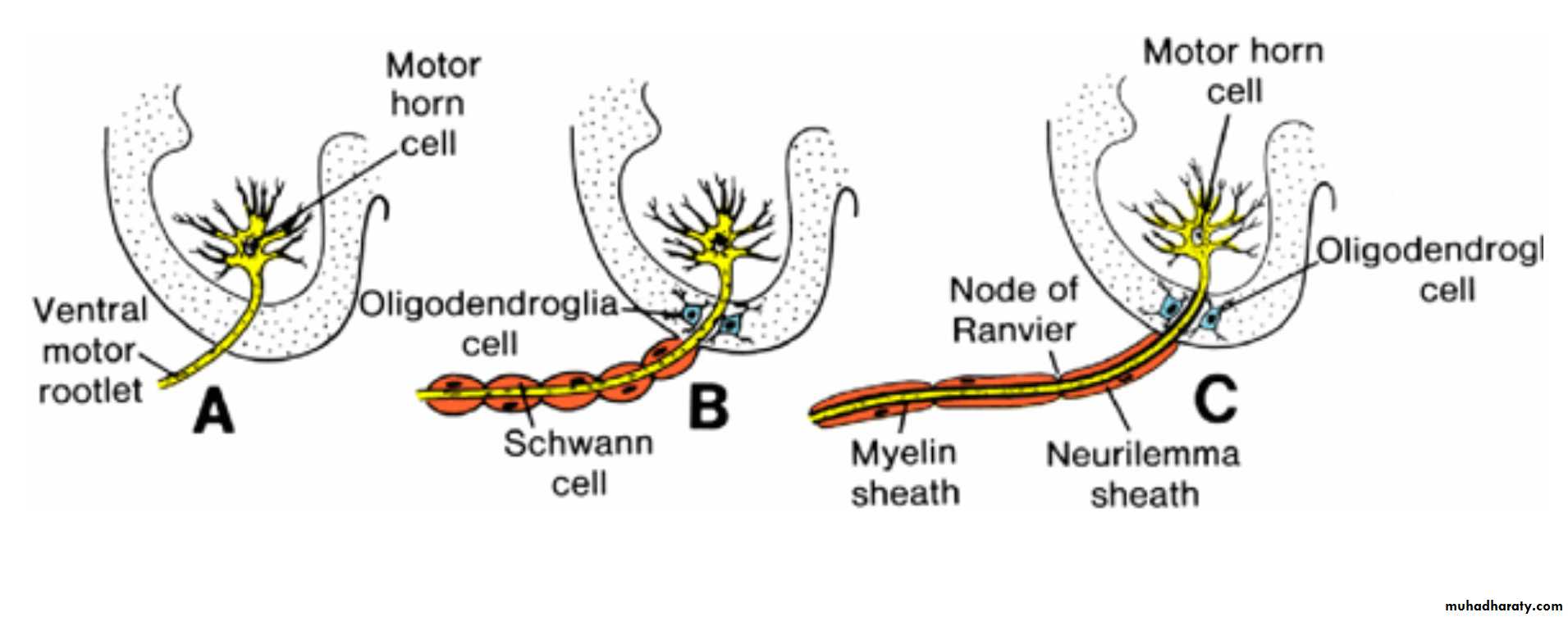 Beginning at the fourth month of fetal life, many nerve fibers take on a whitish appearance as a result of deposition of myelin, which is formed by repeated coiling of the Schwann cell membrane around the axon .The myelin sheath surrounding nerve fibers in the spinal cord has a completely different origin, the oligodendroglial cells .