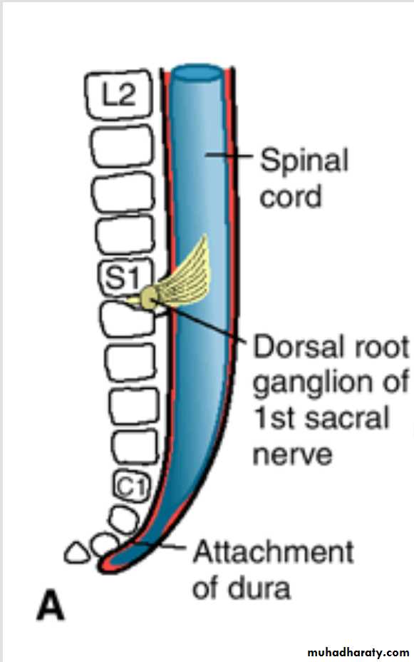 spinal nerves run obliquely from their segment of origin in the spinal cord to the corresponding level of the vertebral column.The Dura remains attached to the vertebral column at the coccygeal level.
