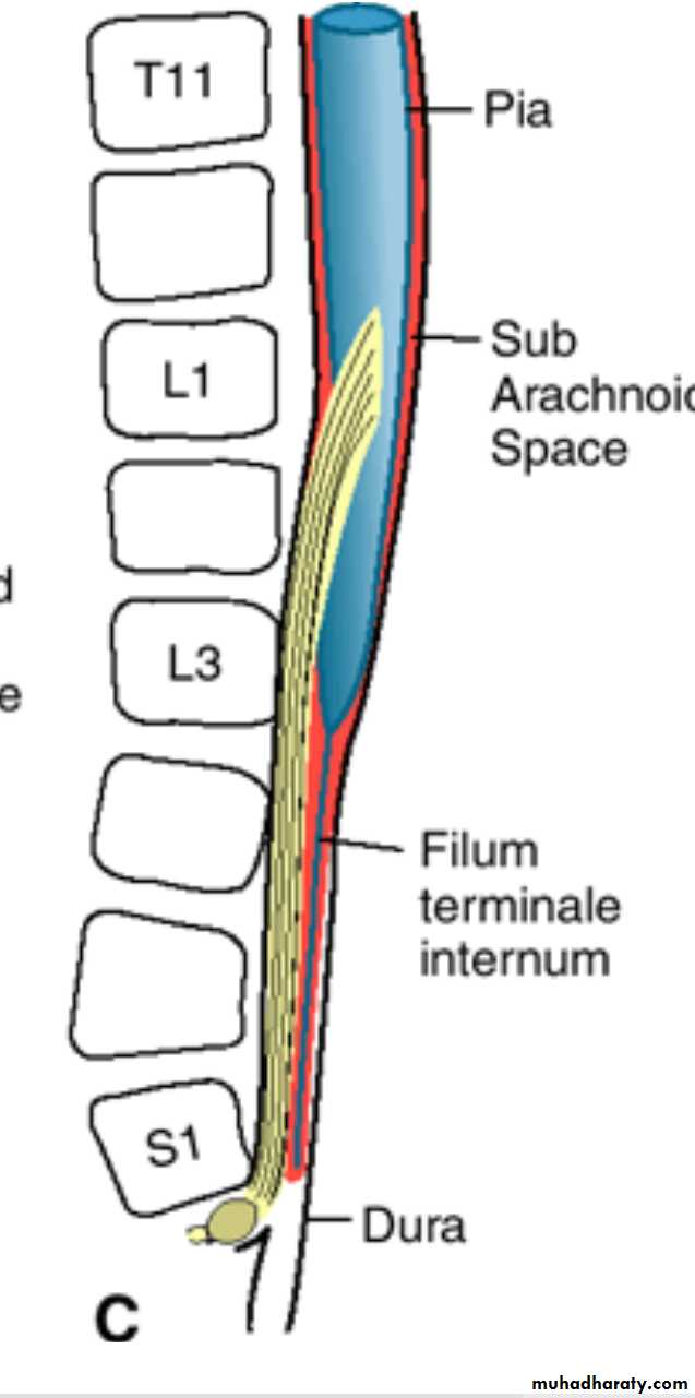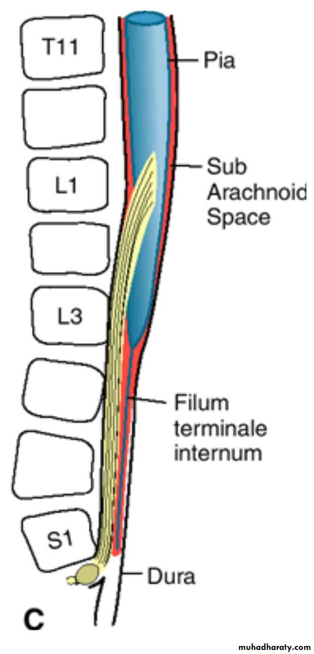 Below L2 to L3, a threadlike extension of the pia mater forms the filum terminale, which is attached to the periosteum of the first coccygeal vertebra and which marks the tract of regression of the spinal cord.