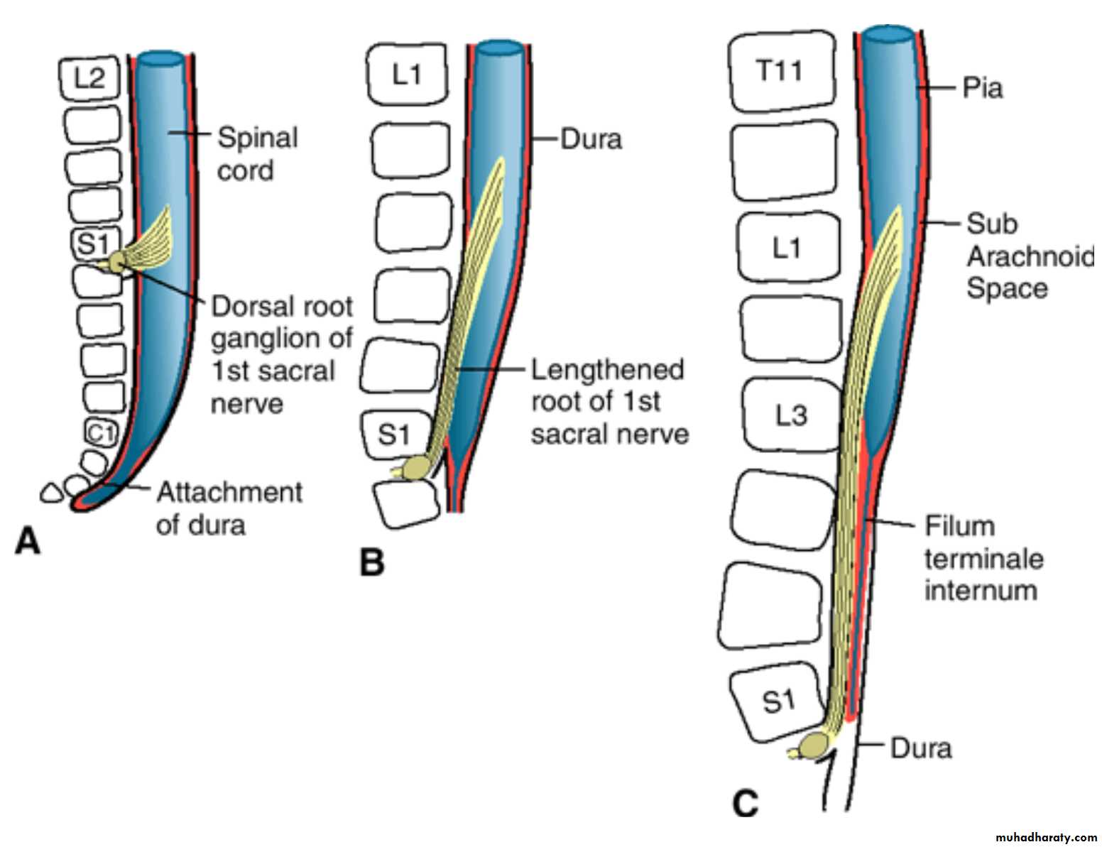With increasing age, the vertebral column and dura lengthen more rapidly than the neural tube, and the terminal end of the spinal cord gradually shifts to a higher level.