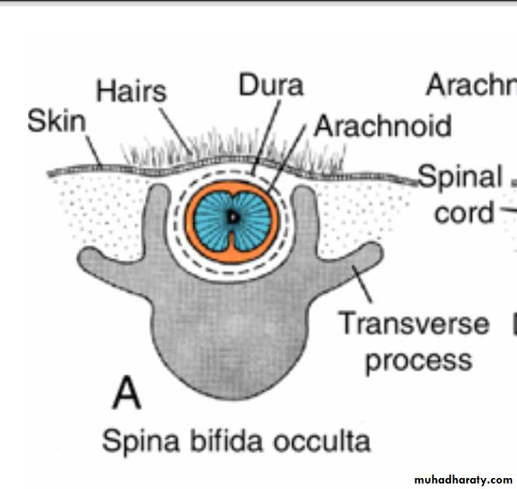 (1) Spina bifida occulta is a defect in the vertebral arches that is covered by skin and usually does not involve underlying neural tissue .It occurs in the lumbosacral region (L4–S1) and is usually marked by a patch of hair overlying the affected region.