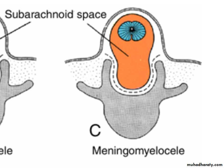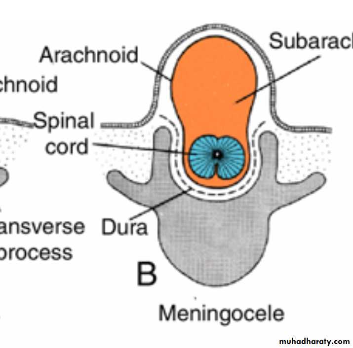 In some cases, only fluid-filled meninges protrude through the defect (spina bifida with Meningocele) ;in others neural tissue is included in the sac (spina bifida with meningomyelocele).