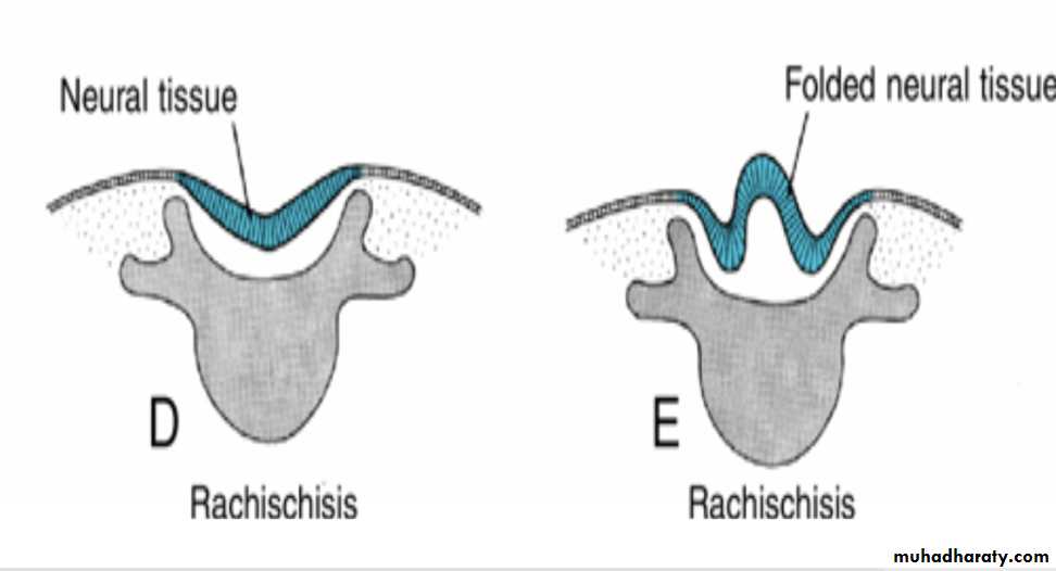 Occasionally, the neural folds do not elevate but remain as a flattened mass of neural tissue (spina bifida with myeloschisis or rachischisis.