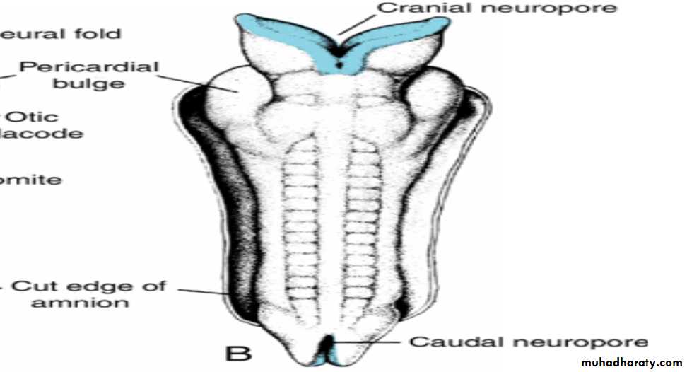 Final closure of the cranial neuropore occurs at the 18- to 20-somite stage (25th day);closure of the caudal neuropore occurs approximately 2 days later.