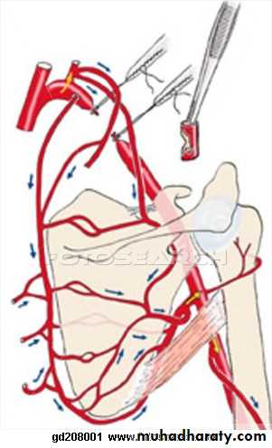 Collateral circulation to arm after ligation of the axillary artery Arrows indicate direction of adjusted blood flow.