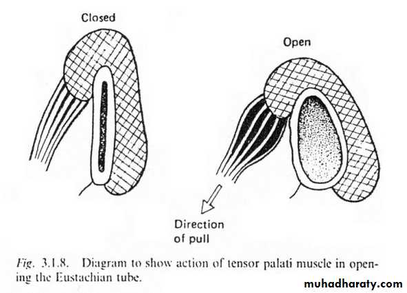 The Eustachian tube connects the tympanic cavity with the nasophrynx, in the adult it is about 36 mm in length. From its pharyngeal end it runs upwards, laterally and backwards. In infants the tube is shorter, wider and more horizontal than in adults. The tube has 2 parts, a pharyngeal cartilaginous part which forms 2/3 of its length, and a tympanic bony 1/3 portion. The upper and medial walls of the pharyngeal portion of the tube are formed by a plate of cartilage. The lateral wall is membranous.There are 3 muscles attached to Eustachian tube these are: